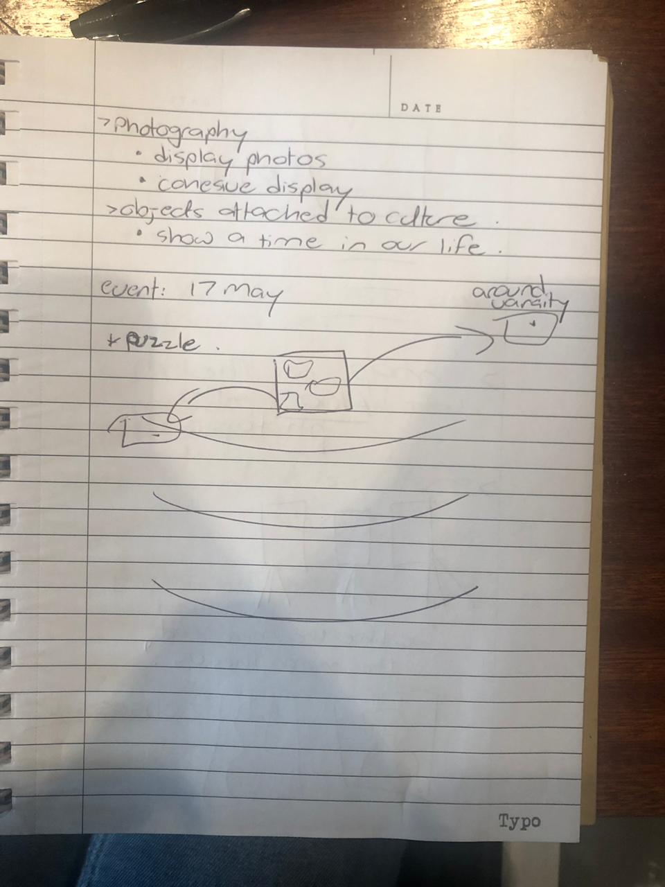 Before we arrived at our final idea that we pitched to George, we went through a couple other ideas and naturally we hit a few roadblocks. we all love photography, so naturally that was our starting point and we were quite clear that our idea would incorporate photography one way or another. We were not sure though how we would respond to the photography focus area. There is a lot that one can do with photography – also, we understood that this was dangerous ground to tread on since George is a professional photographer. So, we knew that we were gonna be faced with a lot of research because whatever we were gonna do needed to be proper – we needed to get our story straight. The ideas we had before our final idea can be seen in the images and notes below. We played around with ideas such as a generic photography exhibition, an installation of photographs around campus in a scavenger hunt kind of manner, and an exhibition consisting of our own personal photographs. With all of the first few ideas we couldn’t quite agree on the theme and the dynamics of the whole thing. In addition to that, we didn’t feel that the ideas were good enough to impress us, George, and the audience. It was also hard to come up with something that would incorporate all the lessons that we needed to learn in organising an exhibition.